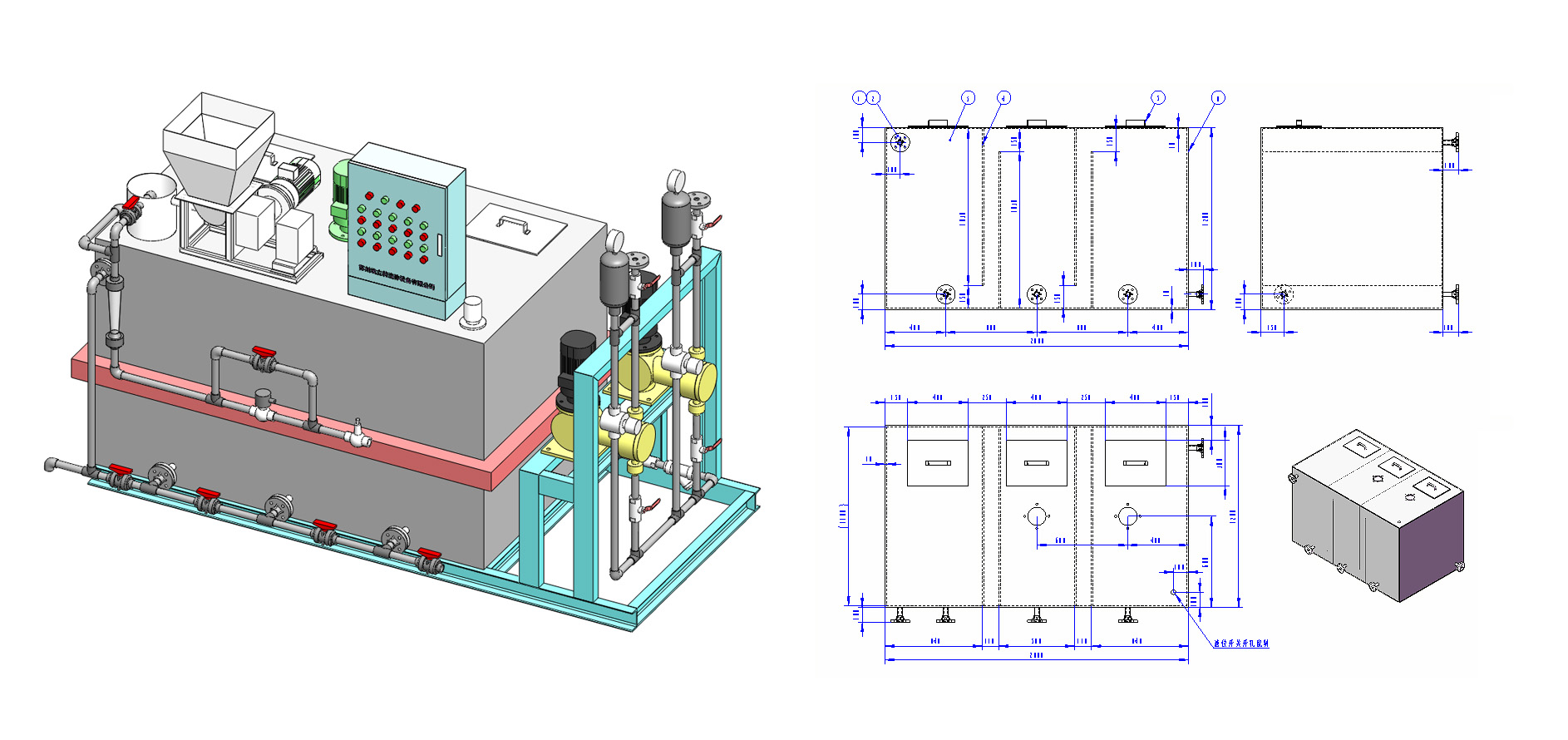 4.箱体采用304不锈钢、PVC材质,采用三槽溢流式溶液操作系统,使设备结构简单、体积小、安装方便。适用于连续溶解和连续添加药剂的环境。
